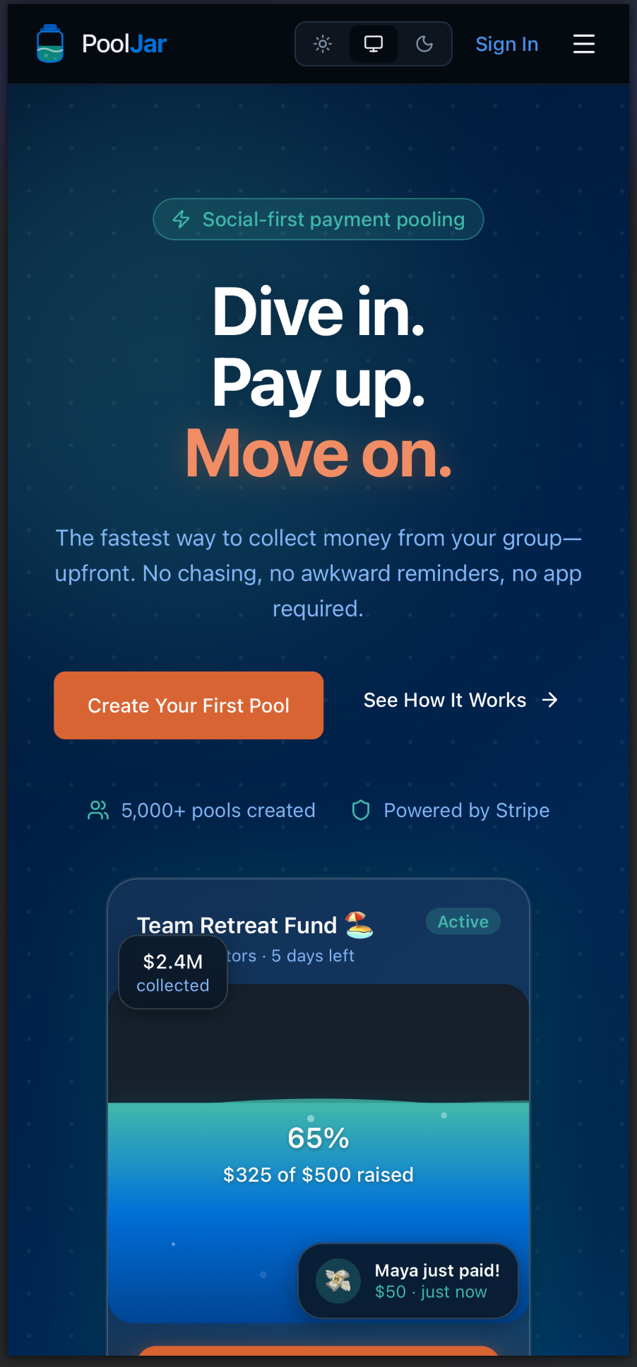 The fastest way to collect money from your group upfront. No chasing, no awkward reminders, and no app required — just simple living links and instant biometric checkout.